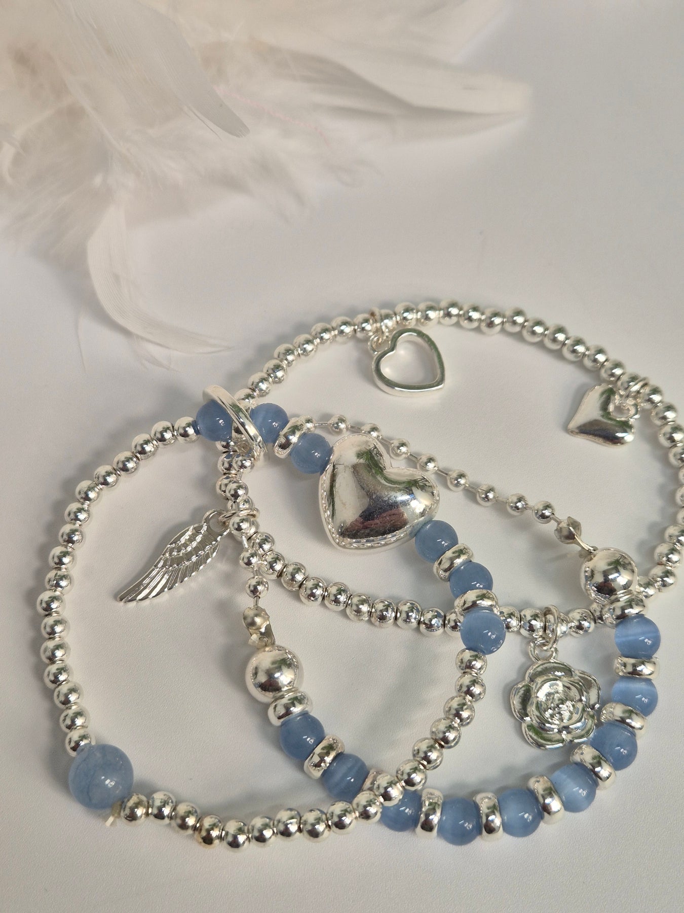 Stacking Bracelets - Angel Wings, Hearts, Camellia Flower - Charms (Blue & Silver Tone)
