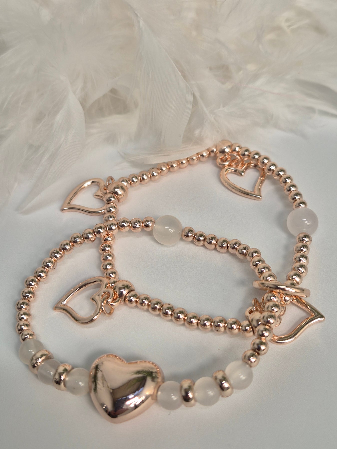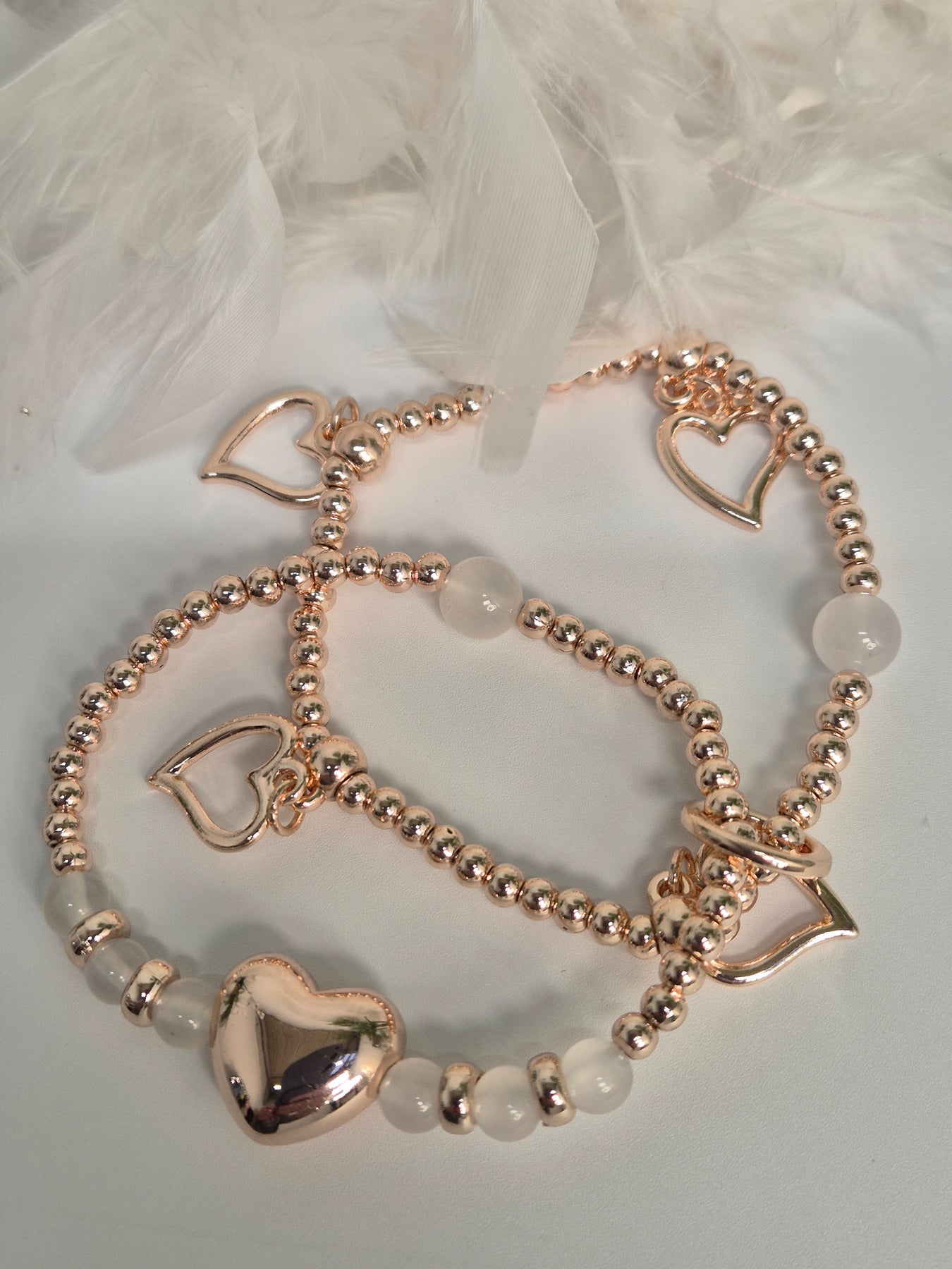 Rose Gold Tone with Pearlised Beads, Rose Gold Tone Beads and Dangling Heart Charms with Oversized Heart