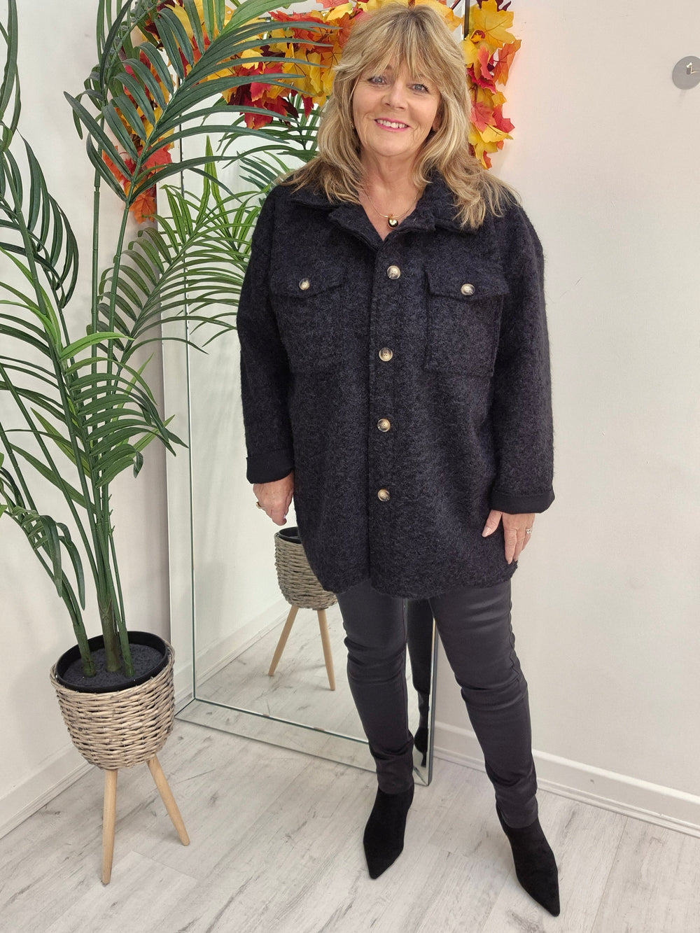 Sue has teamed the Destiny PU Coated Jeans with our Jessica Shacket, Vanessa Long Sleeve Top & Kensington Ankle Boots