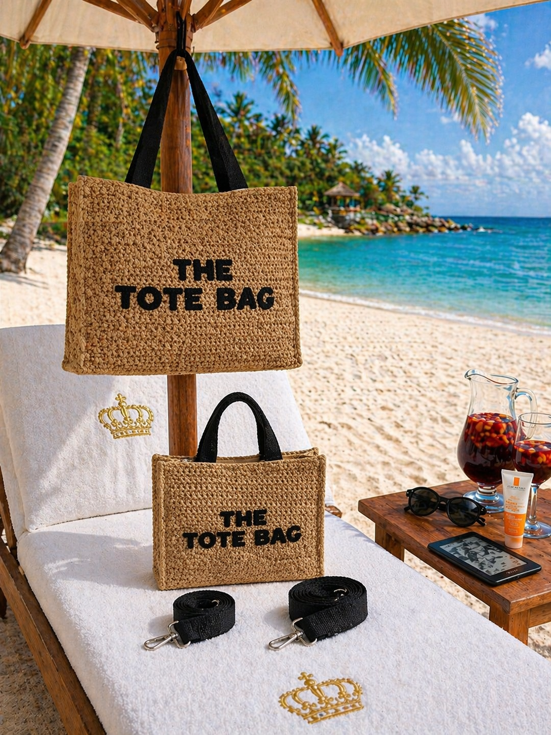Luxe Raffia with 'The Tote Bag' embroidered in Black Boucle