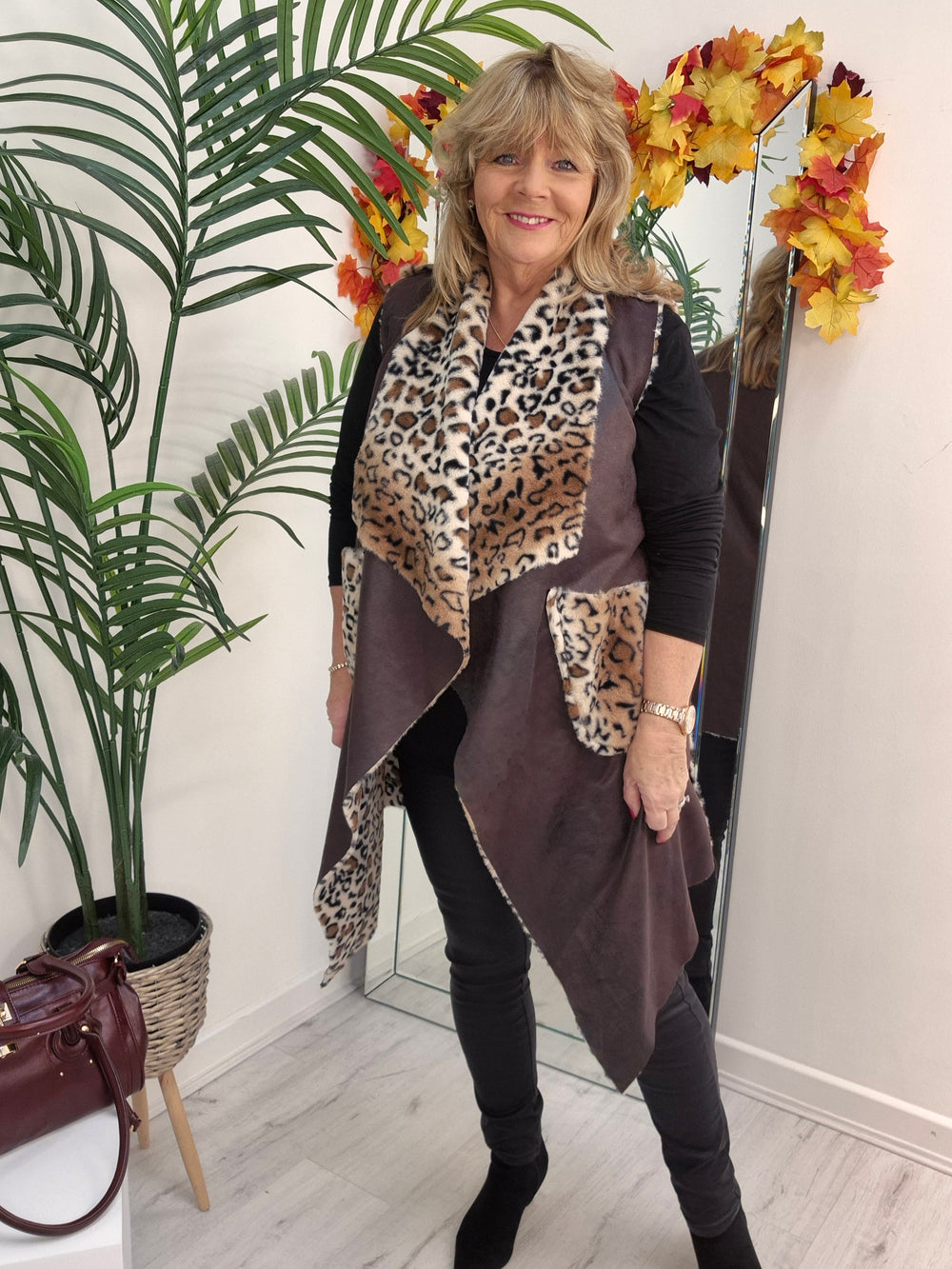 Oslo Faux Fur Reversible Gilet - Chocolate Leopard (Oversized, fitting from Size 12 up to Size 16)