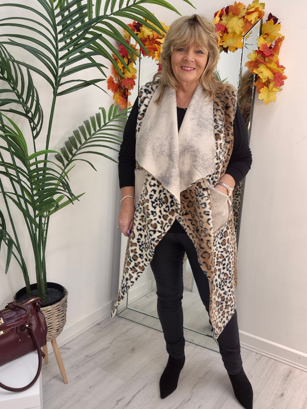 Oslo Faux Fur Reversible Gilet - Stone Leopard (Oversized, fitting from Size 12 up to Size 16)