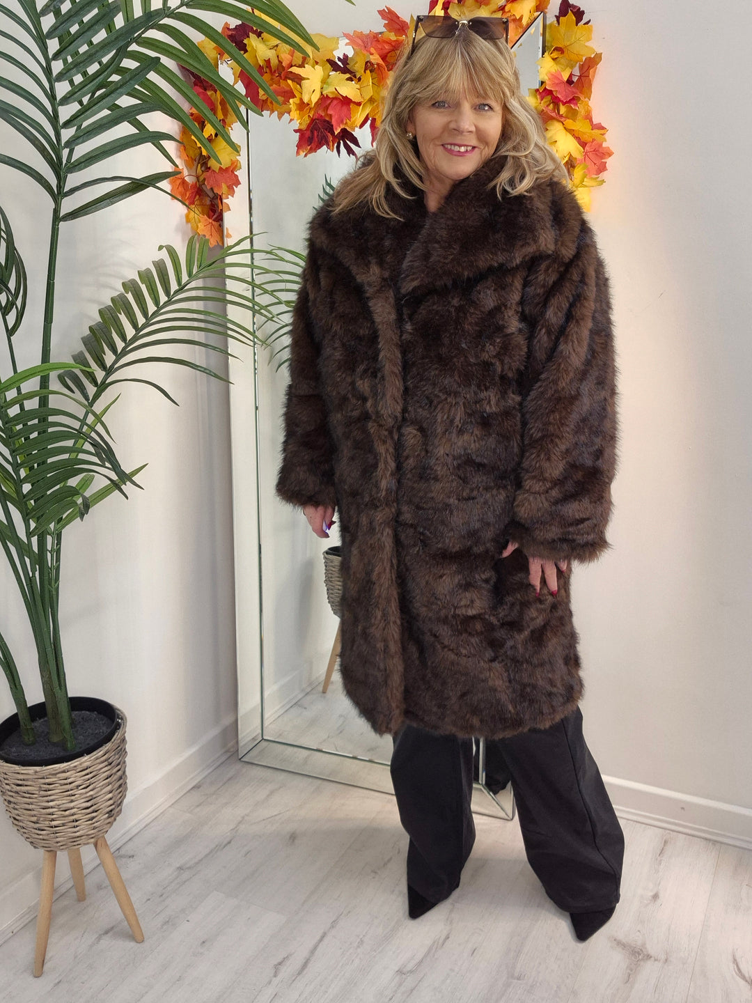 Oslo Faux Fur Coat - Chocolate/Dark Chocolate (One Size/Curvy - fitting from Size 16/18 to Size 20)