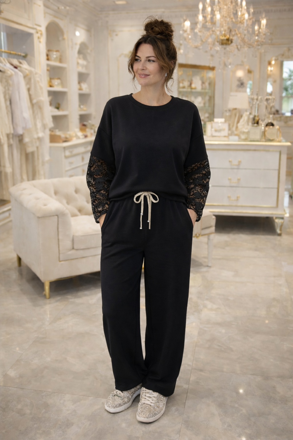 Lace Sleeve Co-ord Two Piece Set - Black (One Size fitting up to Size 16)