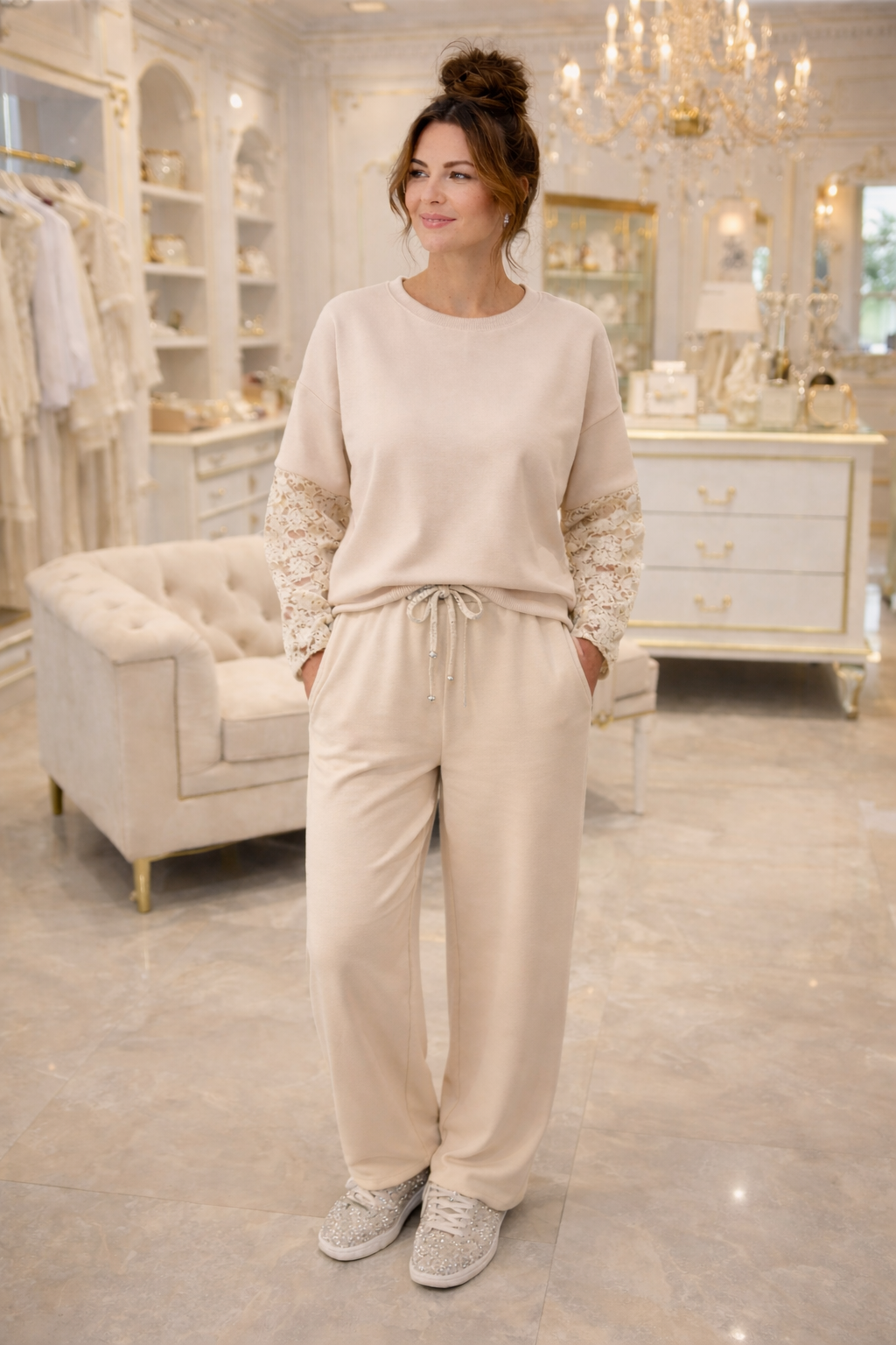 Lace Sleeve Co-ord Two Piece Set - Stone (One Size fitting up to Size 16)