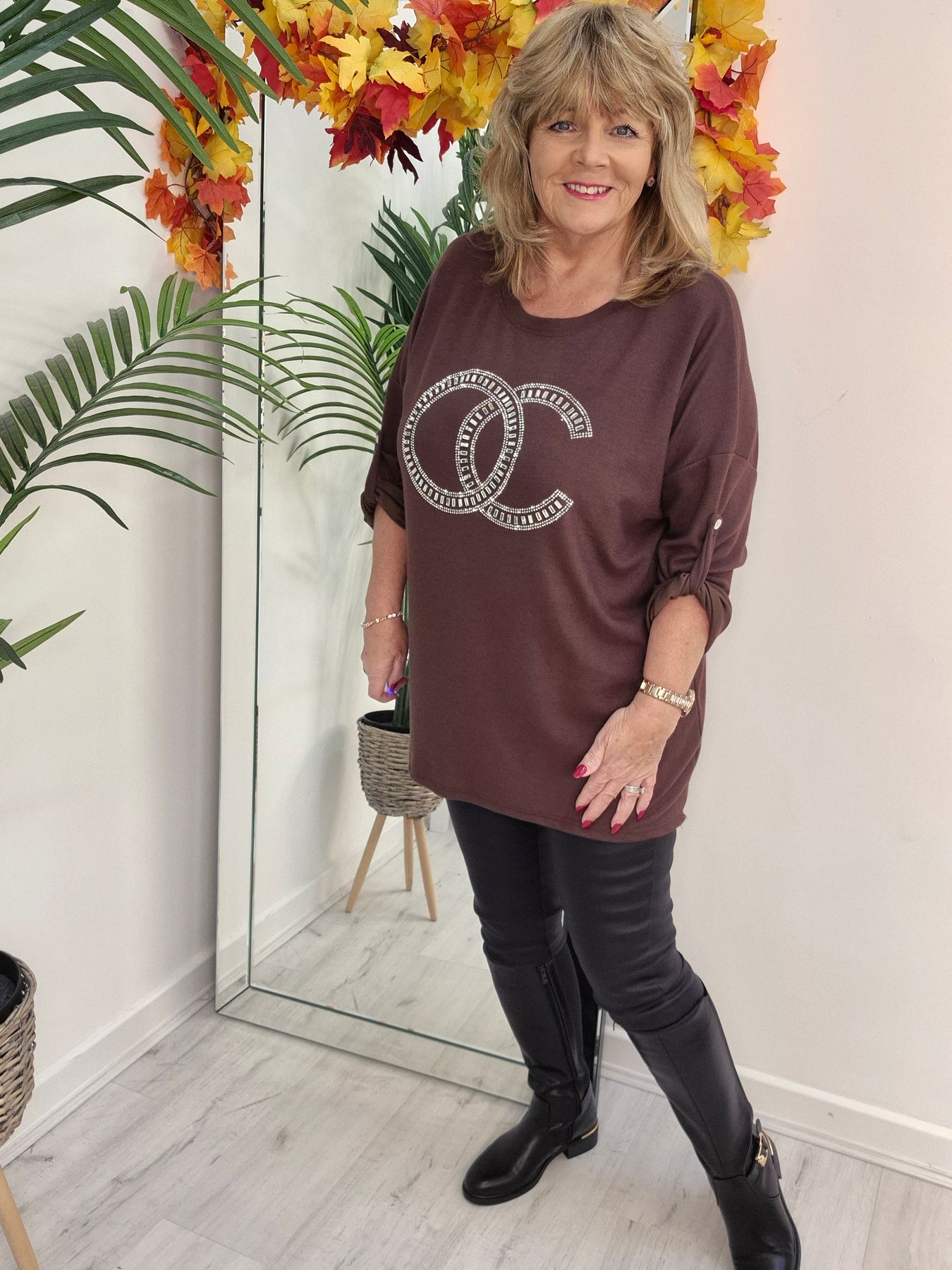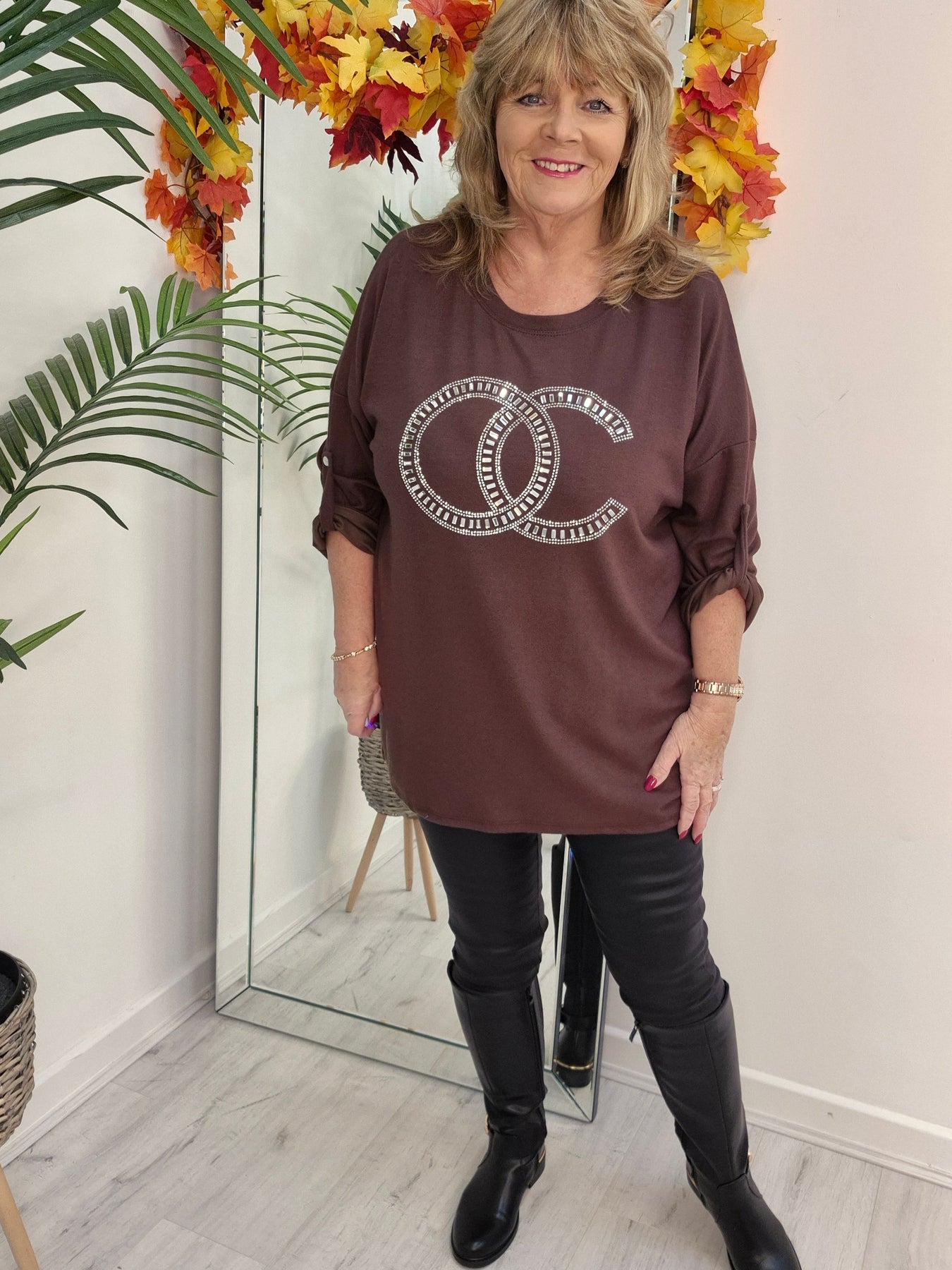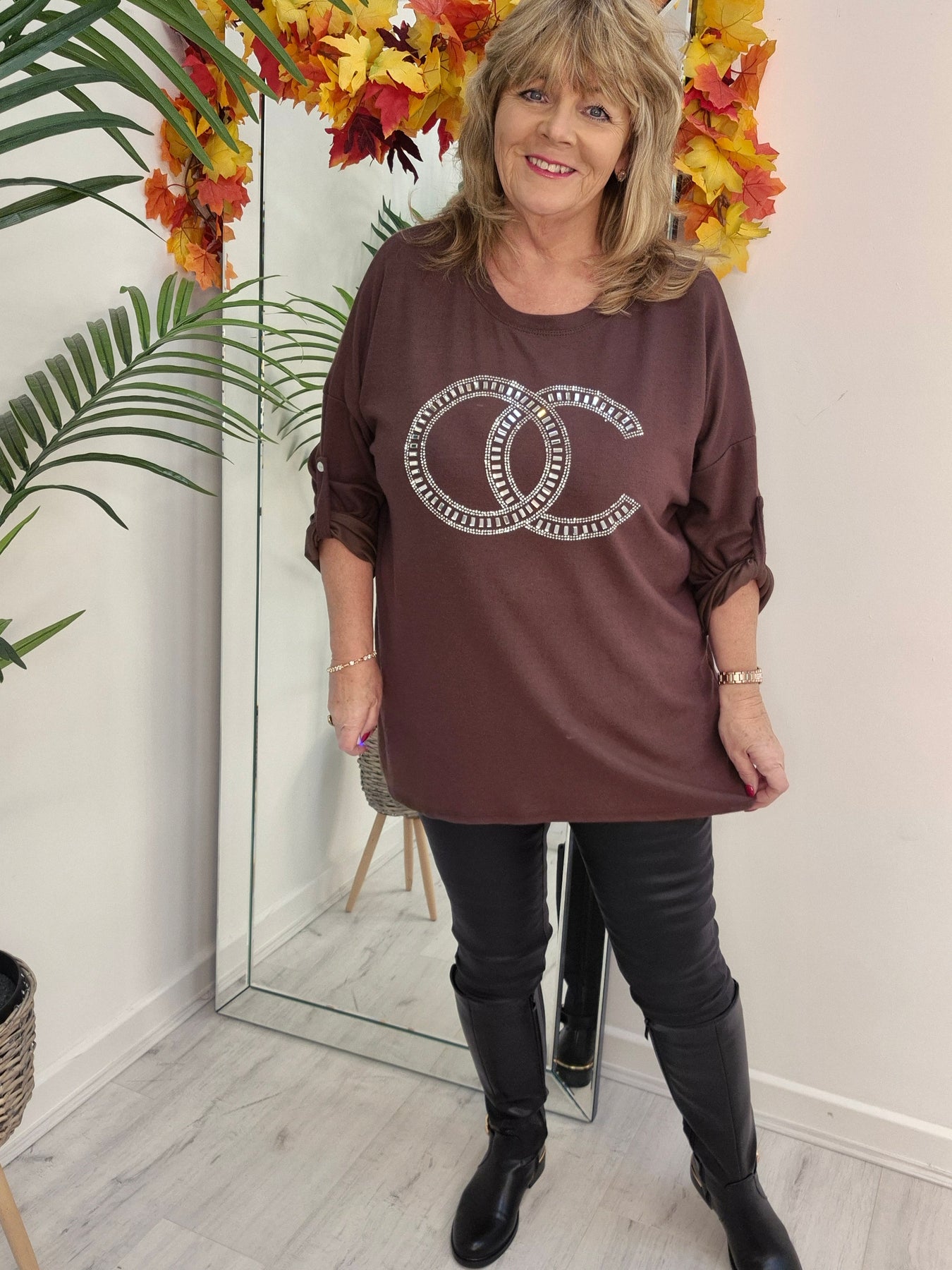 Coco Crystal & Diamante Oversized Hi Low Tops - Chocolate (fits from Size 14 up to Size 18/20)