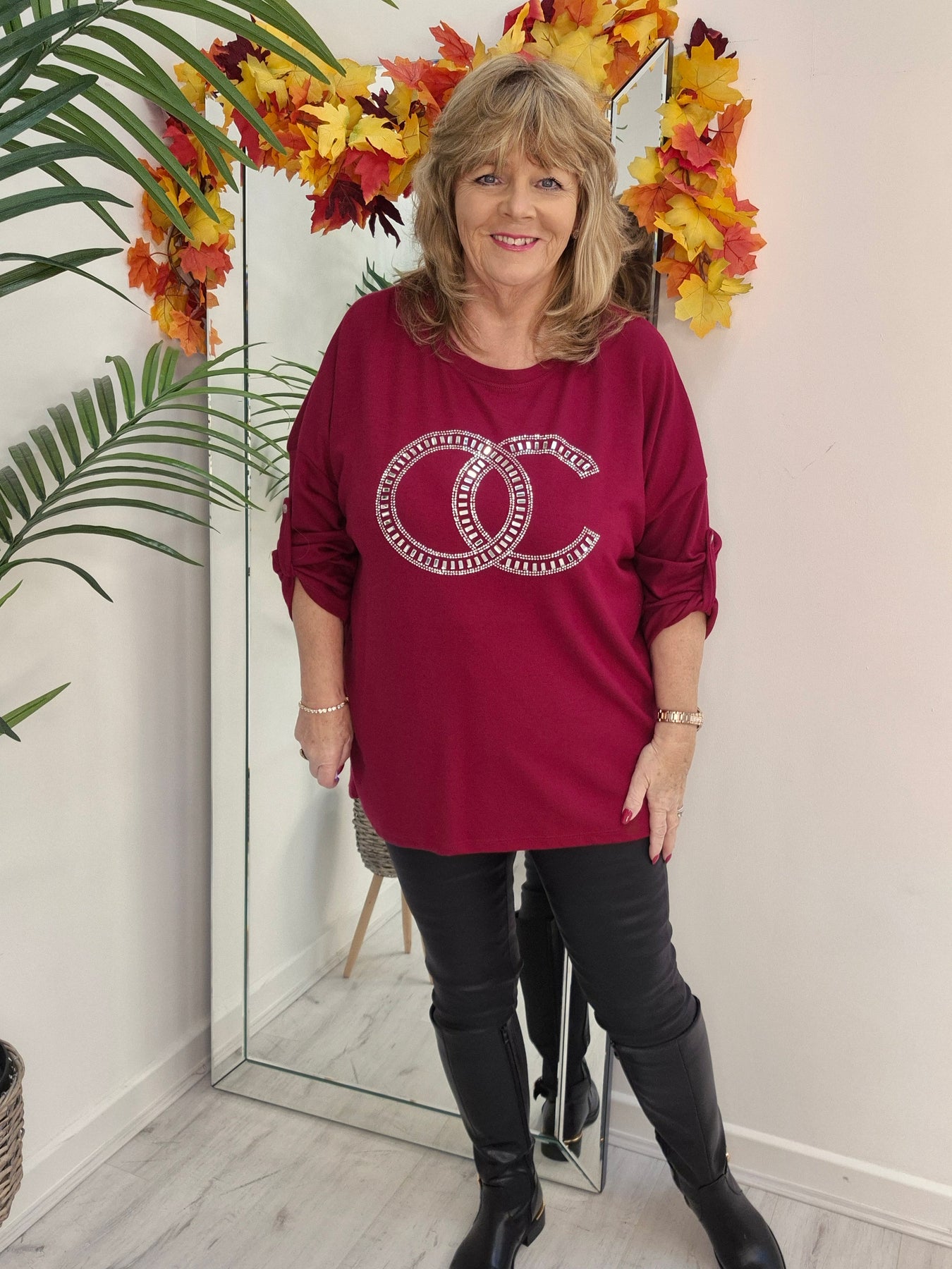 Coco Crystal & Diamante Oversized Hi Low Tops - Wine (fits from Size 14 up to Size 18/20)