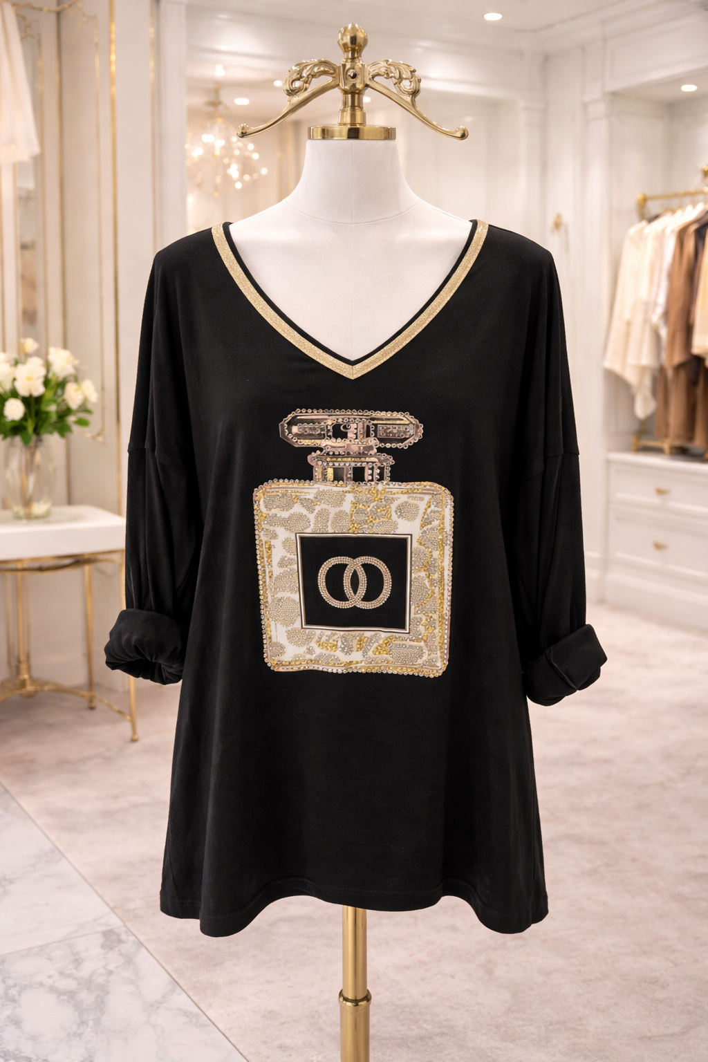 V Neckline with Gold Metallic Trim