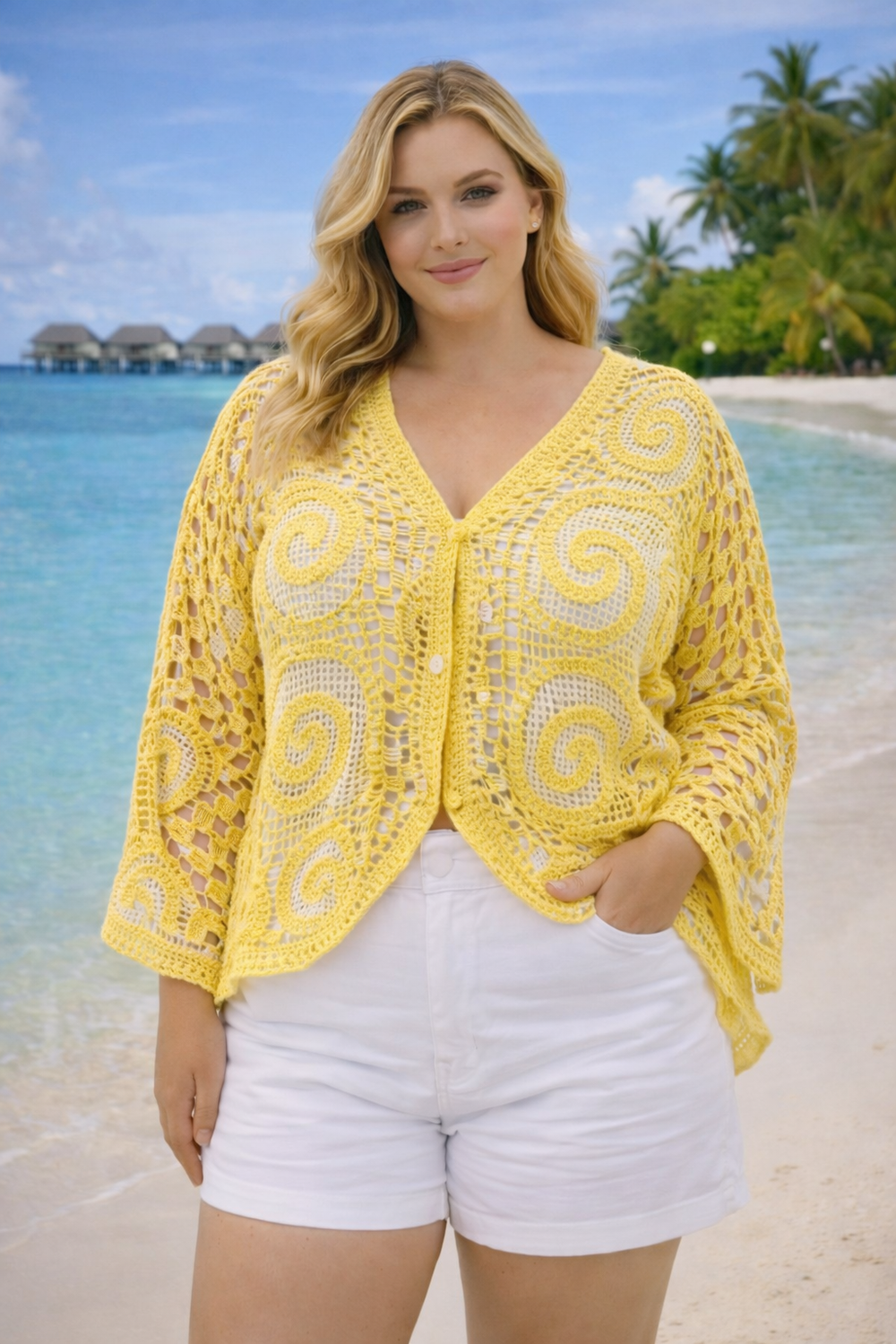Kelly Crochet Cardigan - Yellow (One Size/Curvy - fits from Size 12/14 up to Size 18)