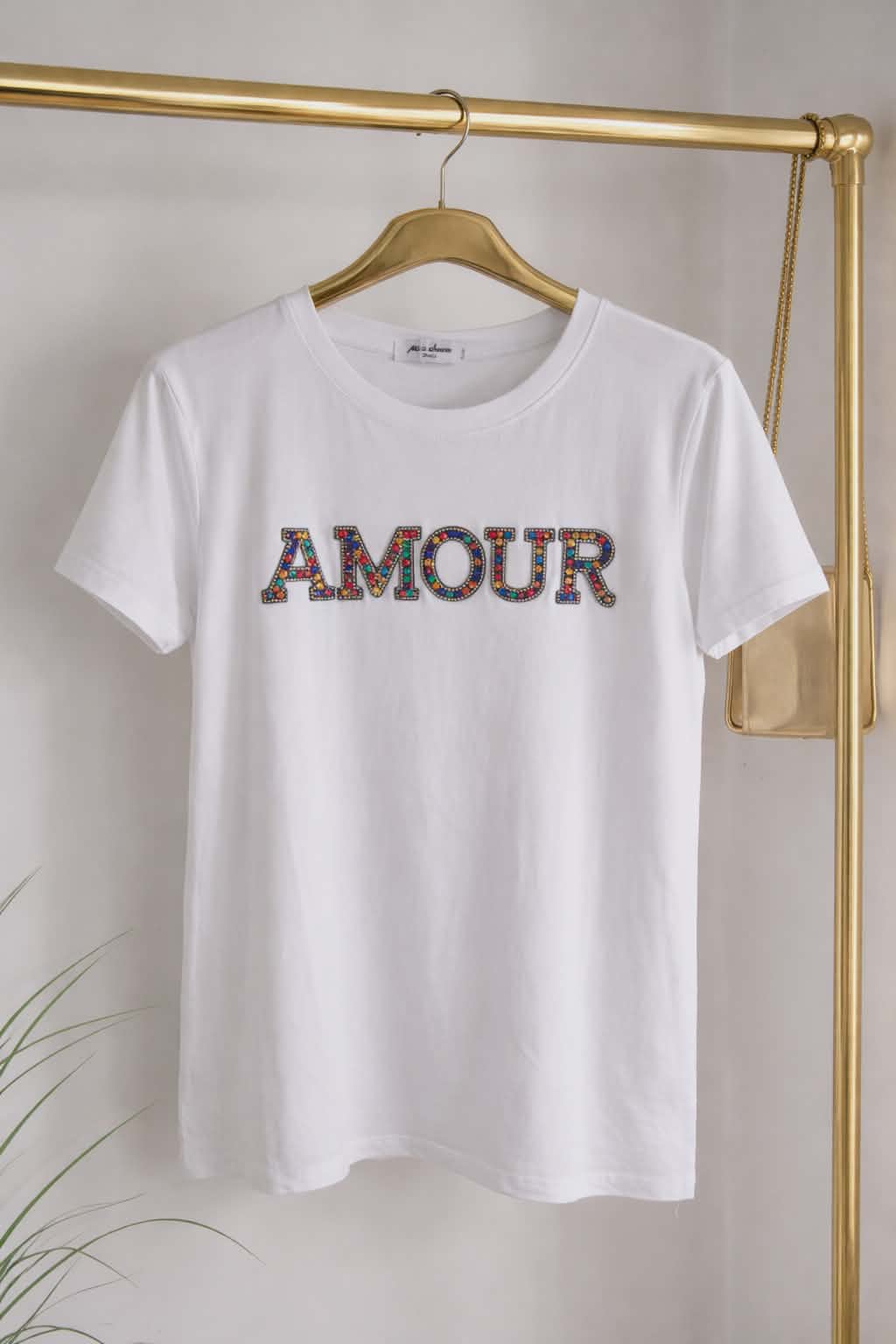 This Tee Shirt has it all, Jewelled Crystals spelling out an AMOUR Logo across the Front, so sparkly