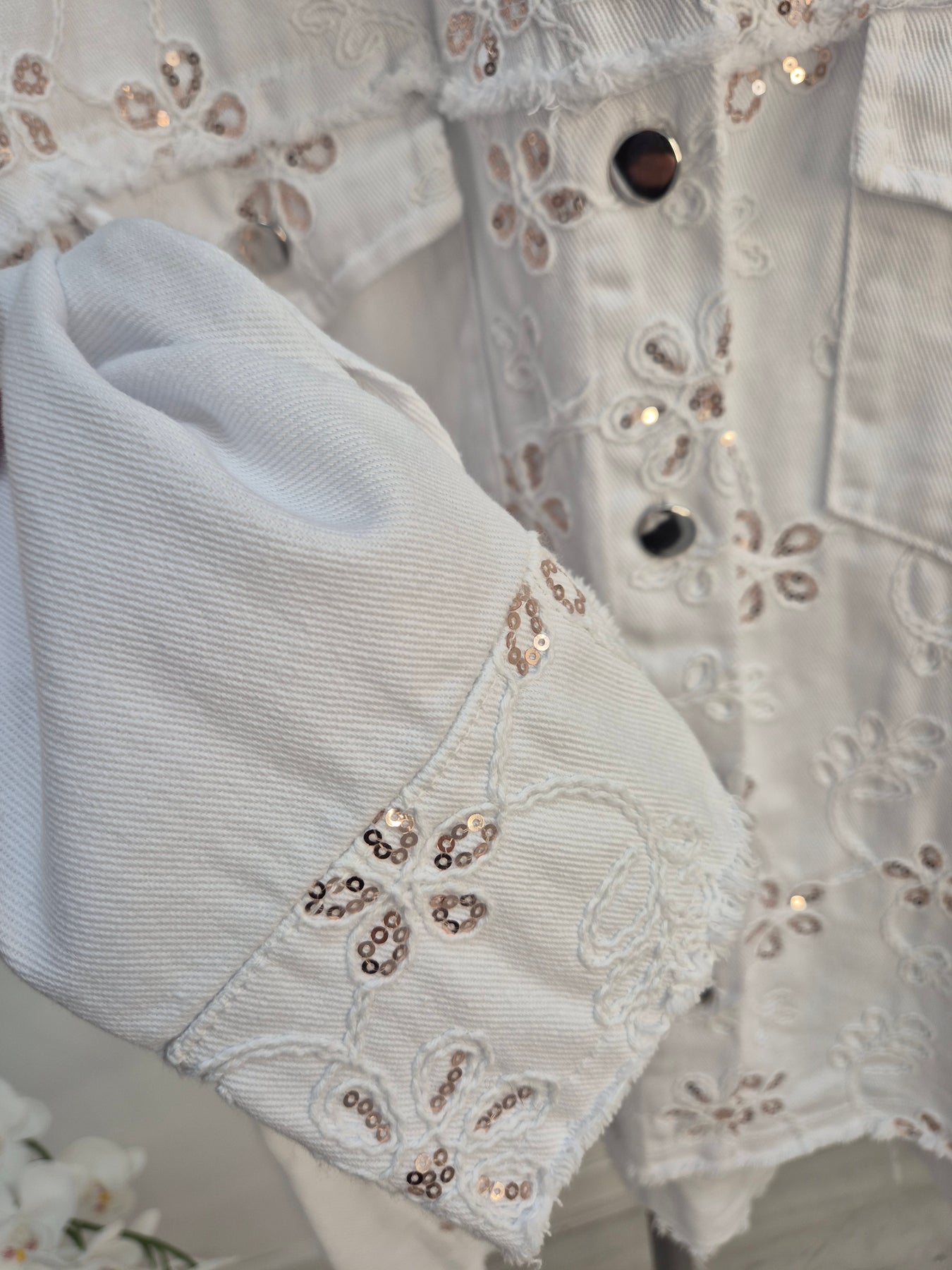 Dana Floral Sparkly Denim Shacket - White (One Size/Curvy, fitting from Size 10/12 up to Size 18) PRE-ORDER FOR DELIVERY MONDAY 2ND MARCH