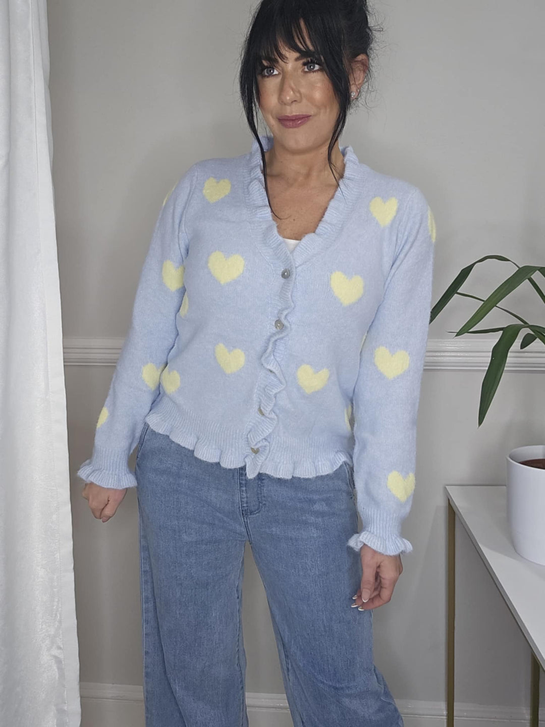Hattie Hearts Ruffled Cardigan (One Size from Size 8 up to Size 16) - Blue/Lemon