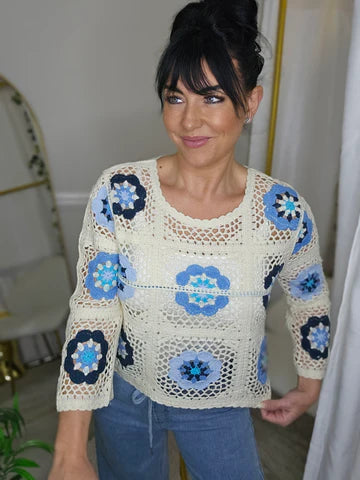 Super Soft Crochet Top with Scalloped Hemline - Blue (Petite/One Size, fits up to Size 14)