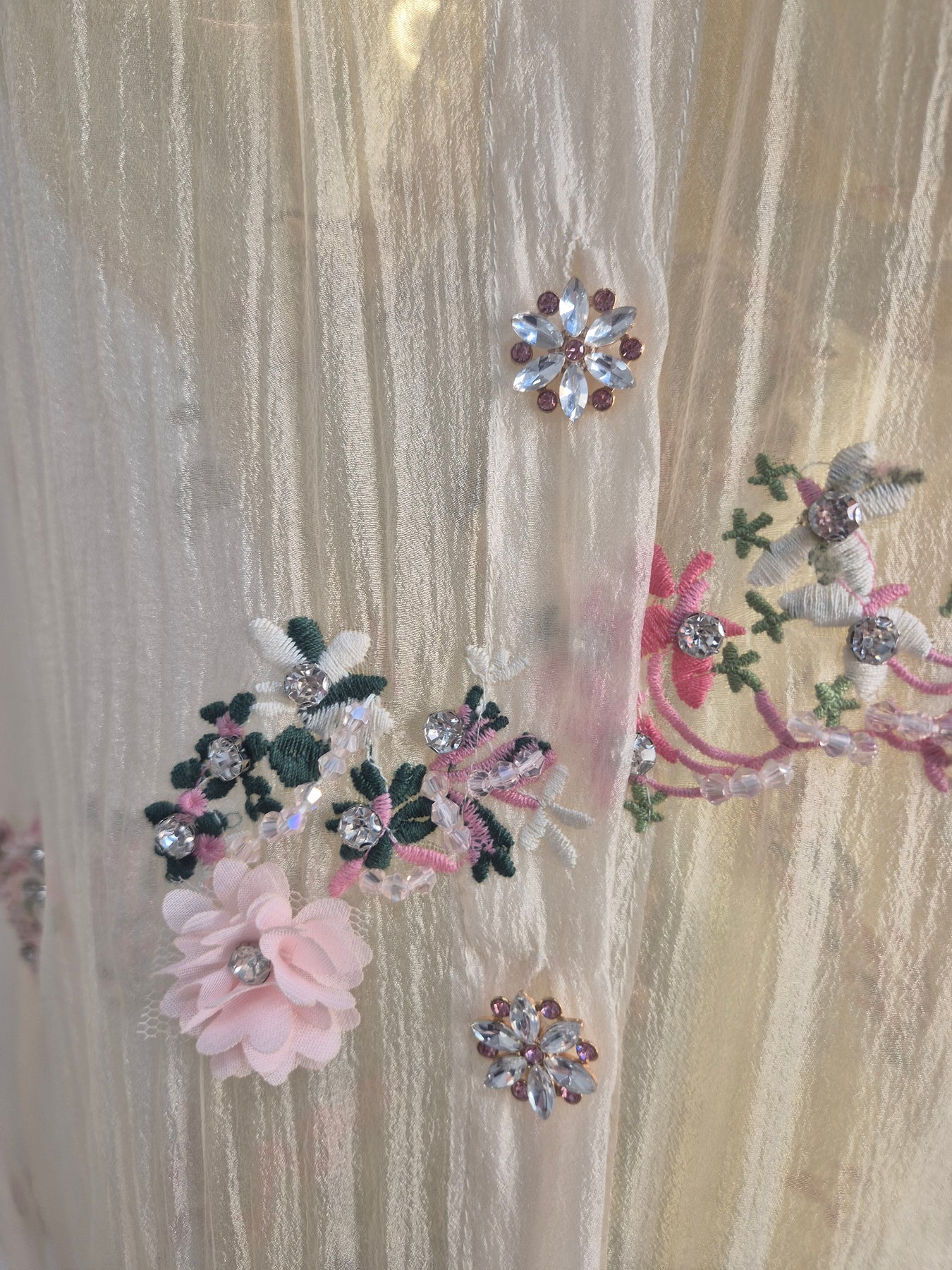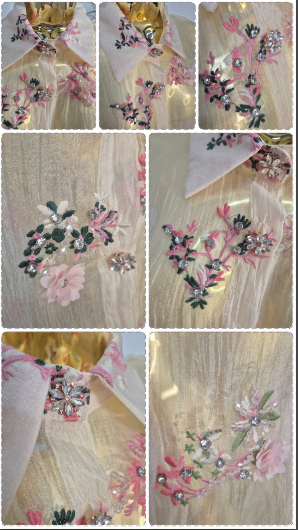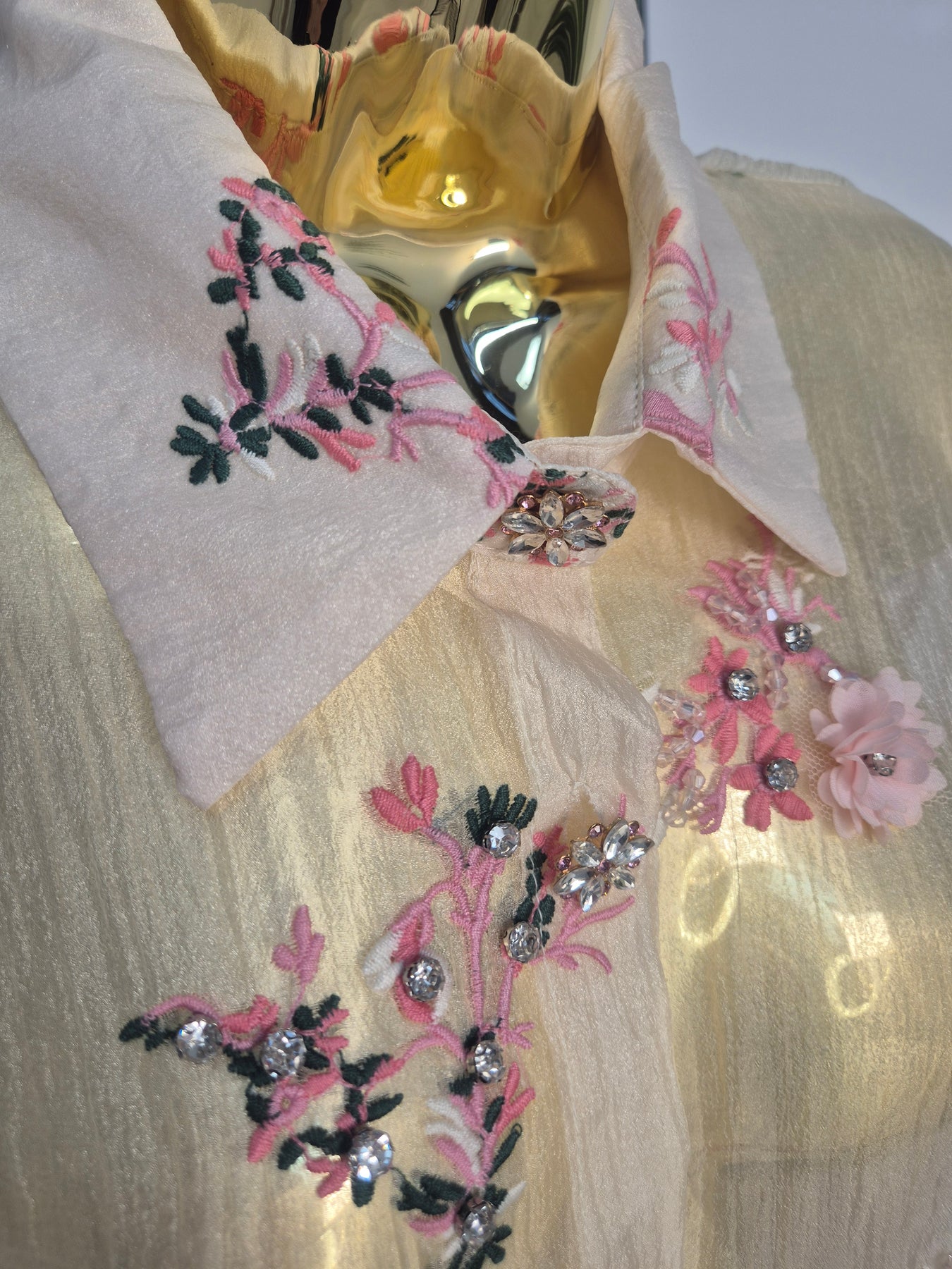 Semi Sheer Floral Blouse with Ornate Embroidery, Faceted Crystal Florals, Faceted Crystals & 3D Florals with Florals