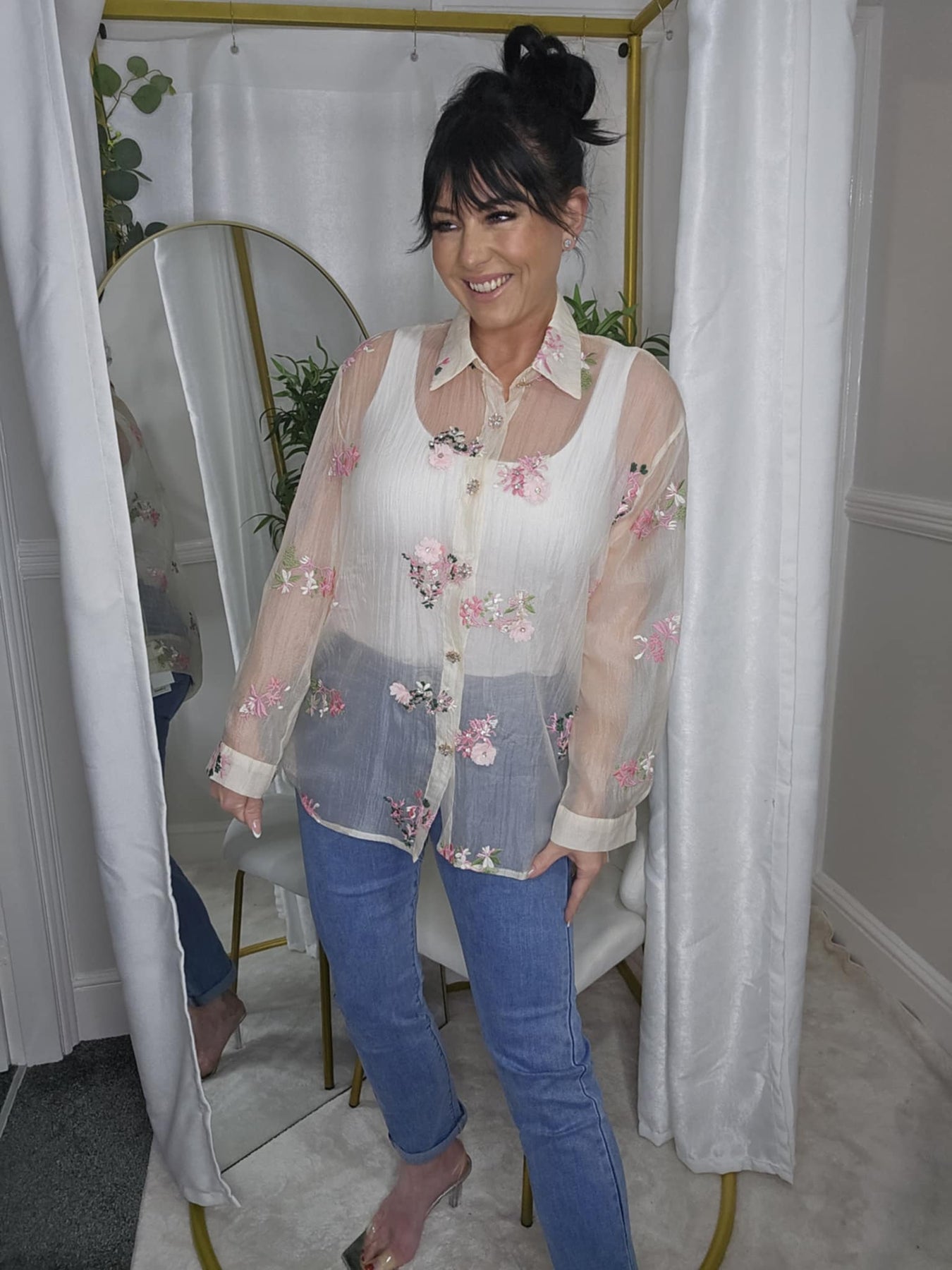 Such gorgeous fabric (Semi Sheer) and in a lovely Floral design, looks fab with our Jeans