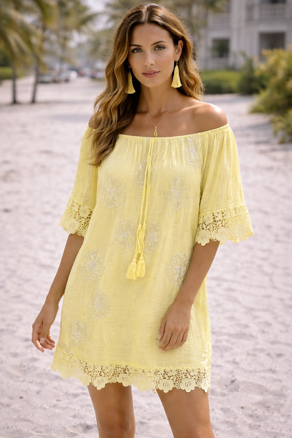 Florence Bardot Top with Sequin Embellishments & Lace Trim (One Size/Curvy - fits Size 12 up to Size 18) - Lemon
