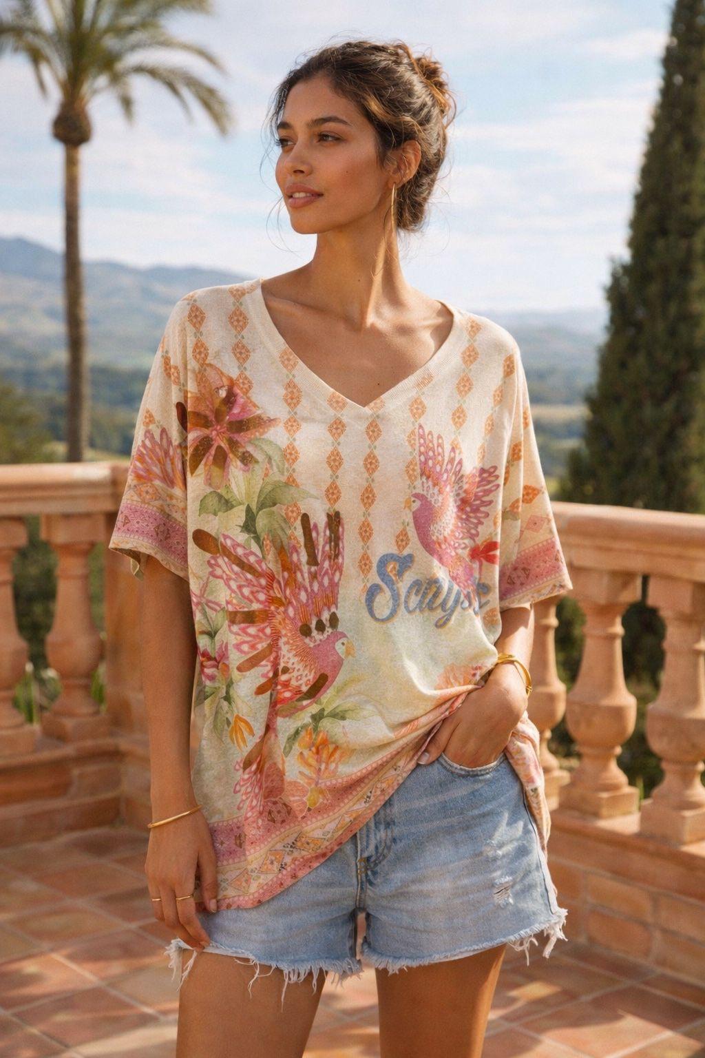 Carla Shimmer Oversized Top - Pink Parrots with Gold Foil (One Size/Curvy fitting from Size 14/16 up to Size 20/22)