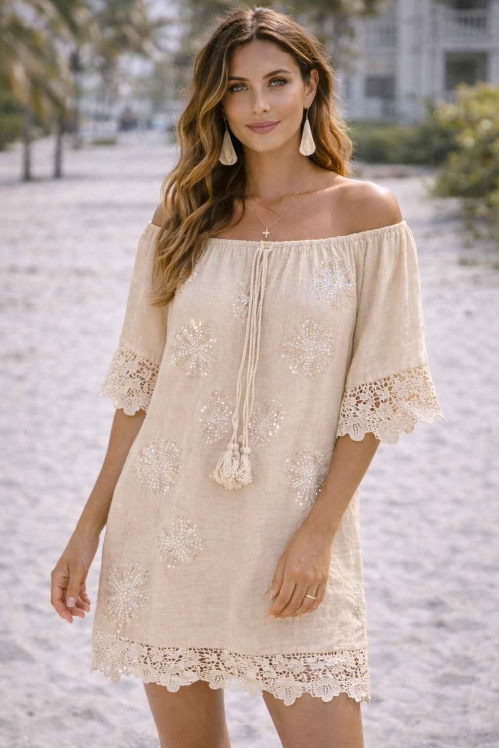 Florence Bardot Top with Sequin Embellishments & Lace Trim (One Size/Curvy - fits Size 12 up to Size 18) - Beige
