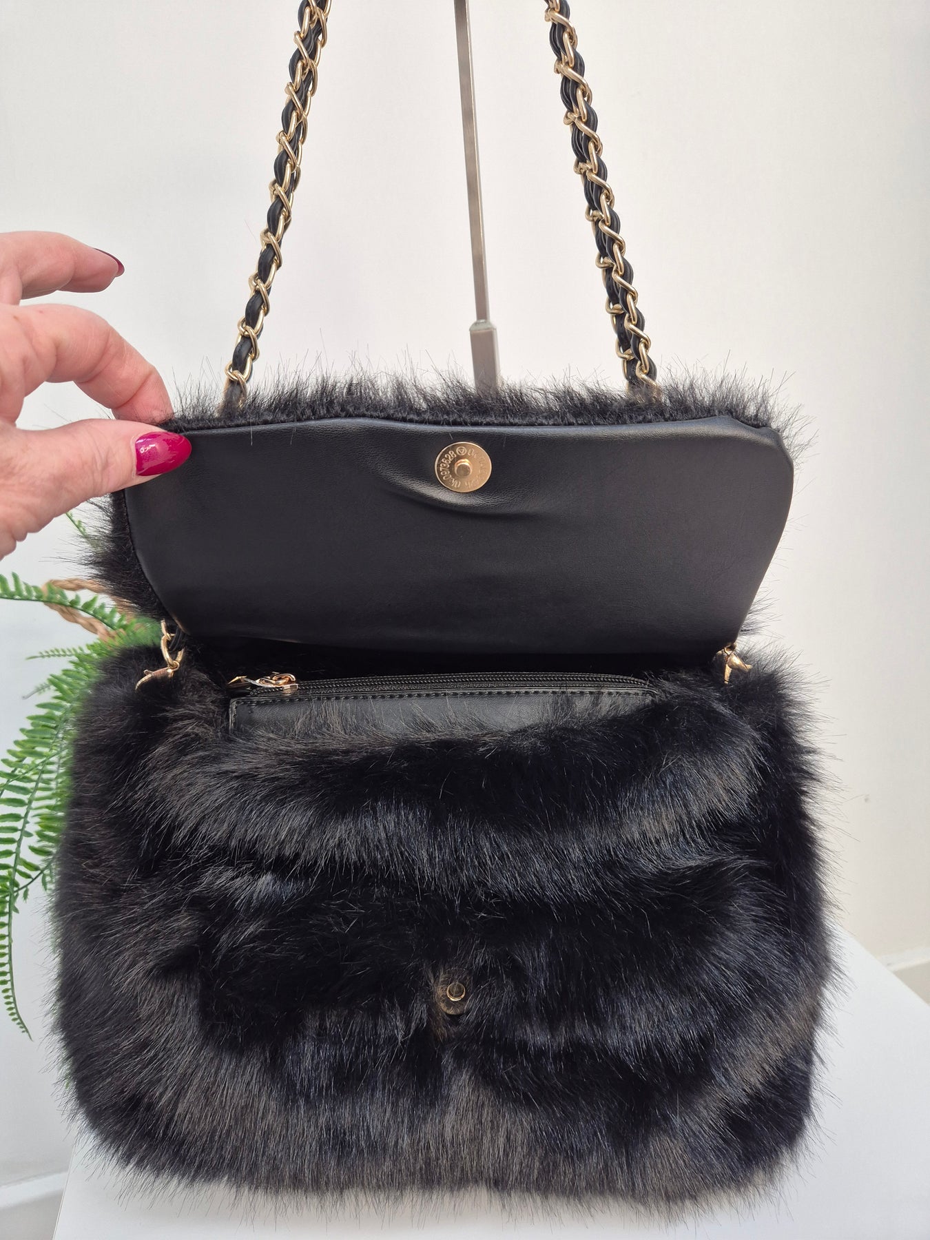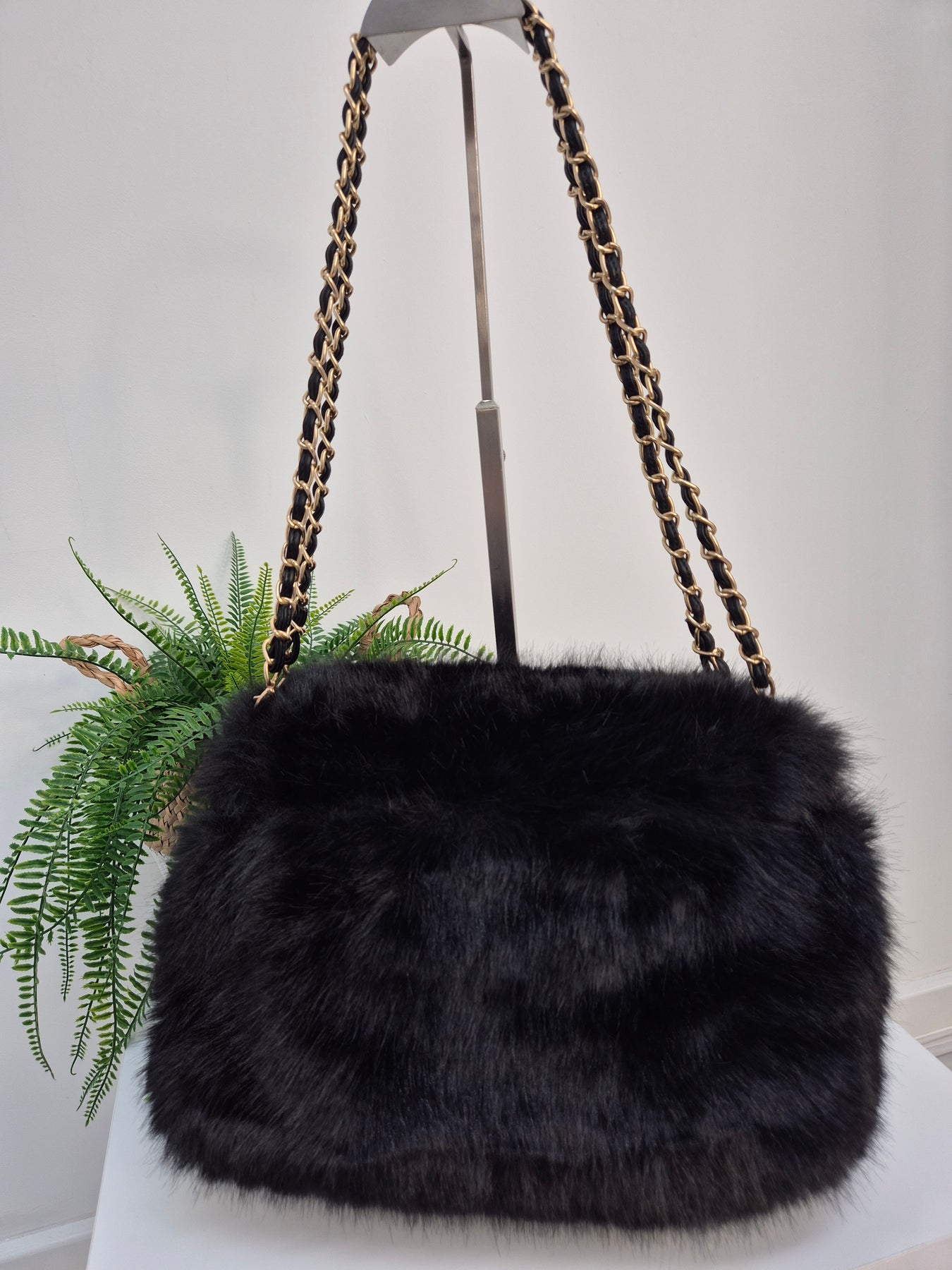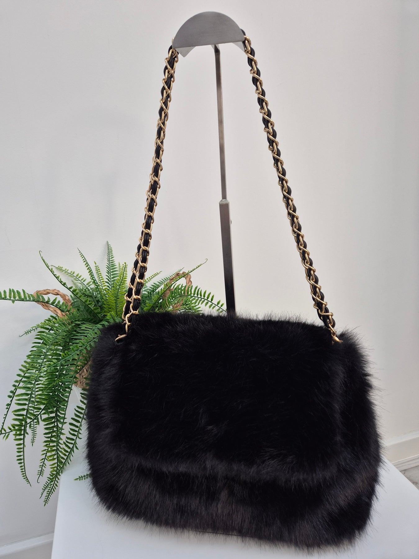 Oslo Faux Fur Bag with Gold Chain Link Dual Handles - Black