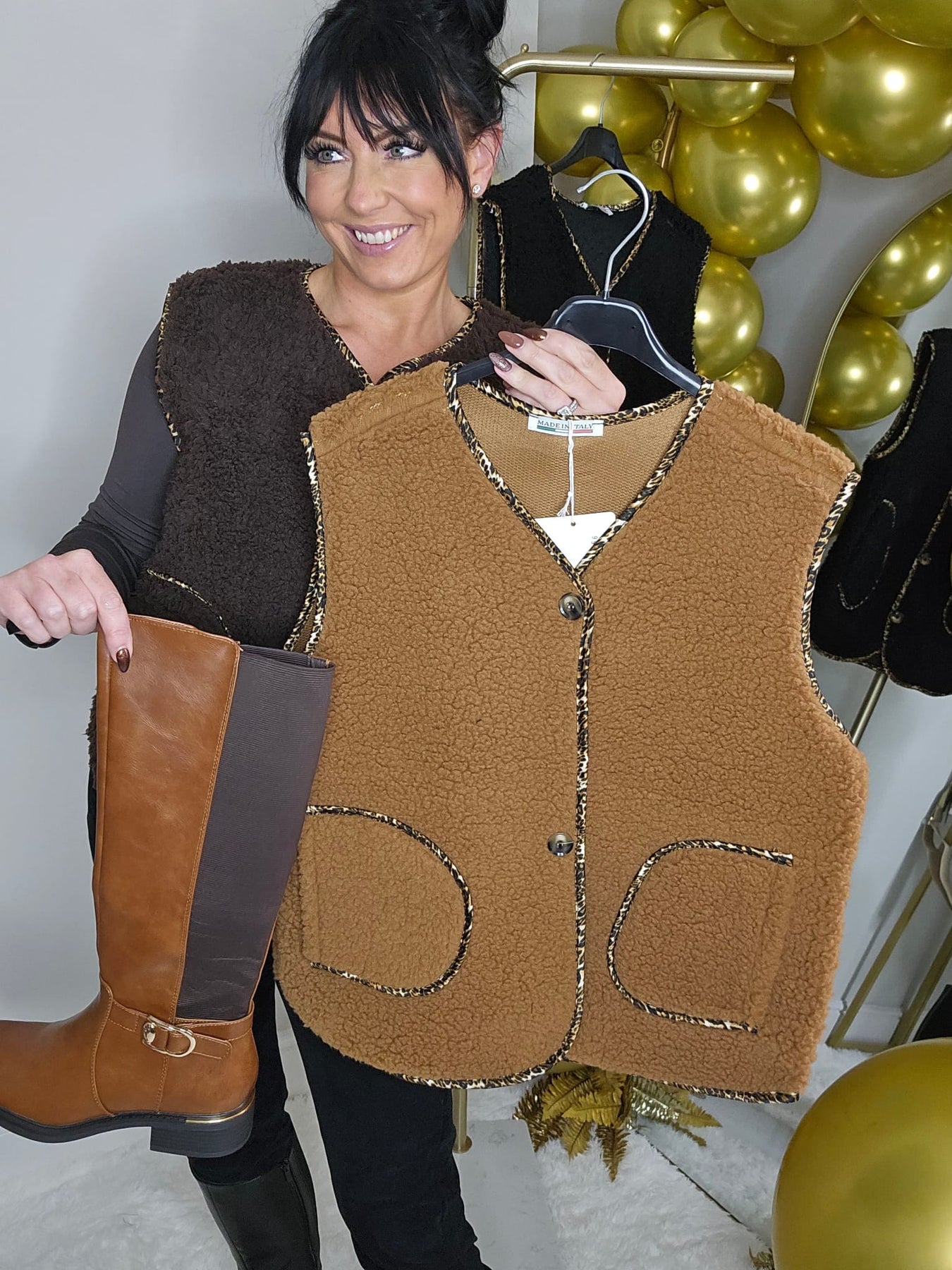 Teddy Waistcoat with Leopard Trim - (One Size fits from Size 8 to Size 16) - Caramel