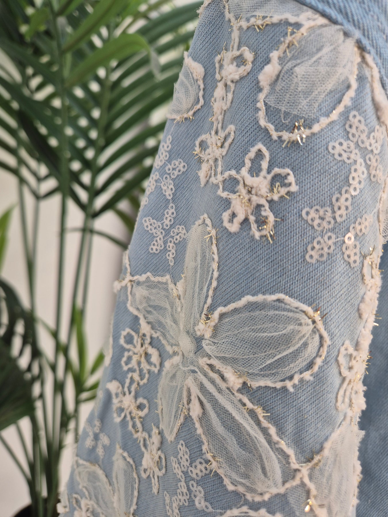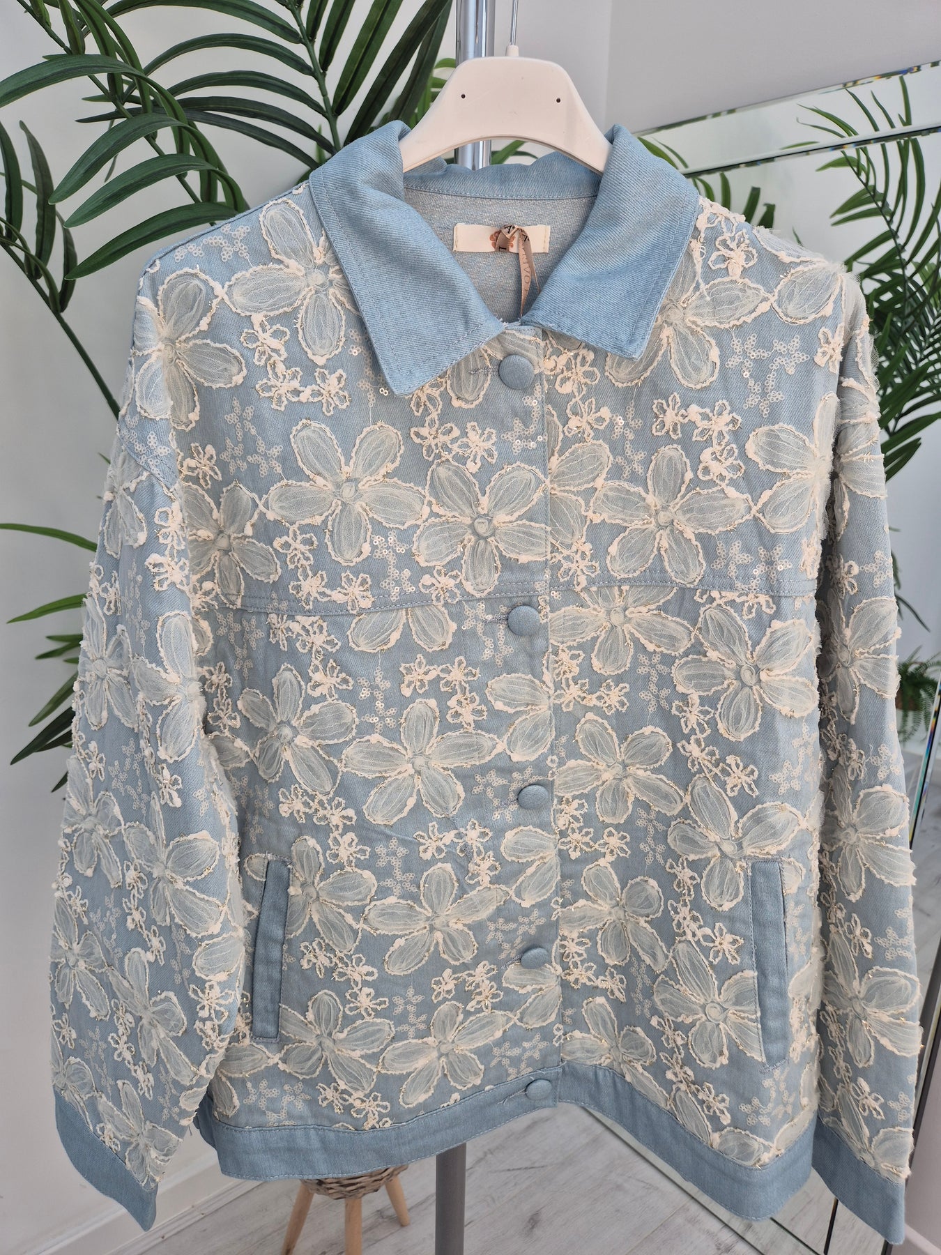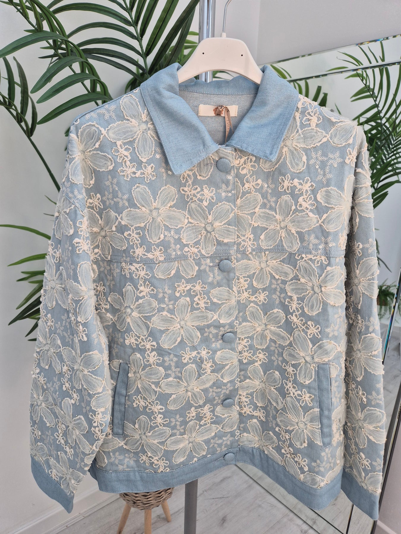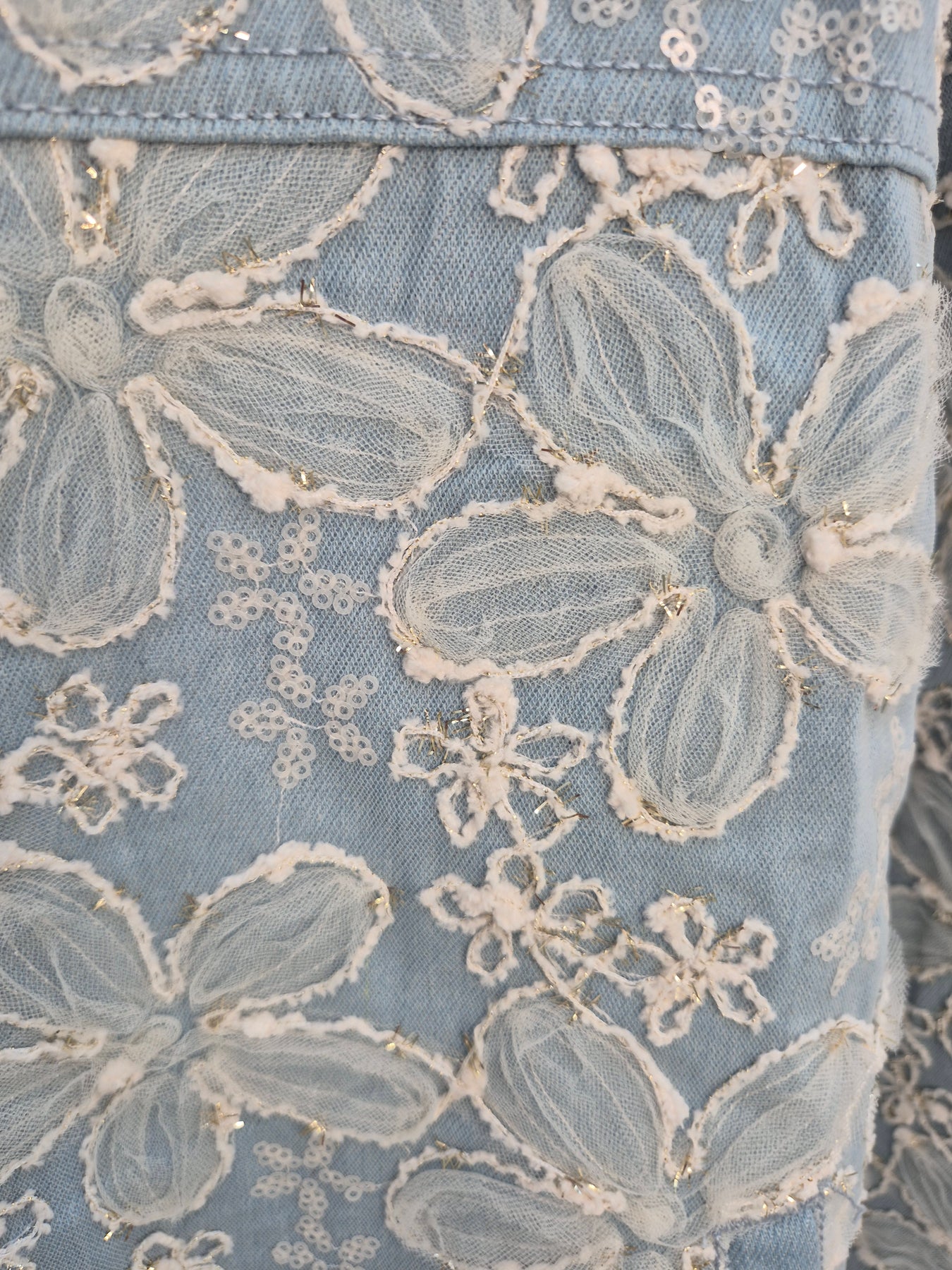 Darcy Denim Jacket - Applique Florals/Gold Metallic (One Size/Curvy, fitting from Size 14 up to 18)